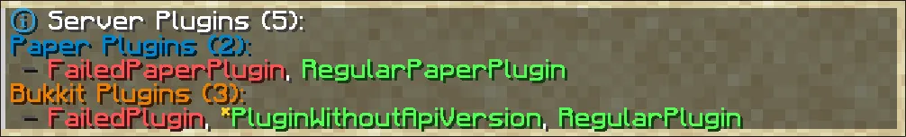 Section titled “plugins (alias: pl)”The plugins command displays the list of all loaded plugins. Paper differentiates between two types of plugins: Paper plugins and Bukkit plugins. The difference is generally only relevant to plugin developers (guide to paper-plugin.yml). Plugins are marked as green if no issues occurred whilst enabling them and their functionality can be assumed working. Plugins marked red failed to load or were disabled. Check the startup logs for more information if that happens.